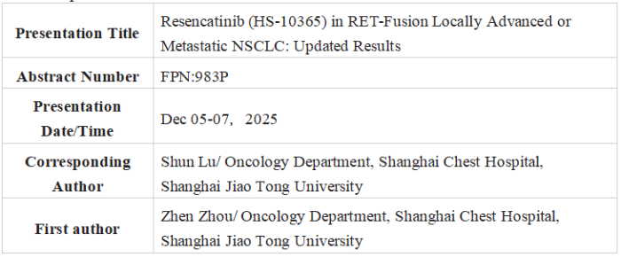 1. Zhou Z, Wang Q, Wu L, et al. Resencatinib (HS-10365) in RET-fusion positive locally advanced or metastatic non-small cell lung cancer (NSCLC): Updated results [poster 983P]. Presented at: 2025 ESMO Asia Congress; December 5-7, 2025; Singapore.