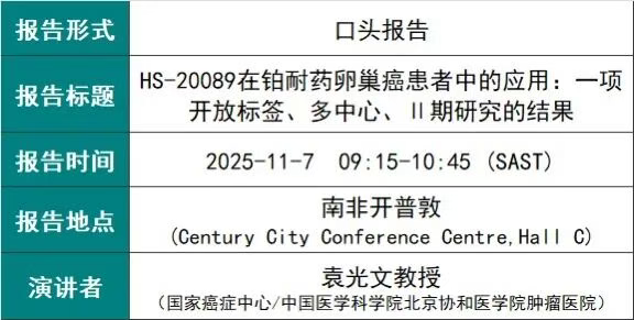 翰森制药集团有限公司(以下简称“翰森制药”,03692.HK)今日宣布,公司自主研发的B7-H4靶向抗体-药物偶联物(ADC)注射用HS-20089(合作方代码:GSK5733584),用于铂耐药卵巢癌(PROC)患者治疗的II期研究结果于2025 年 11 月 5—7 日在南非开普敦世纪城会议中心举行的2025年国际妇科癌症学会(IGCS)全球会议上以口头报告的形式再发表。此前,该研究结果已于2025年欧洲肿瘤内科学会(ESMO)年会上首发。