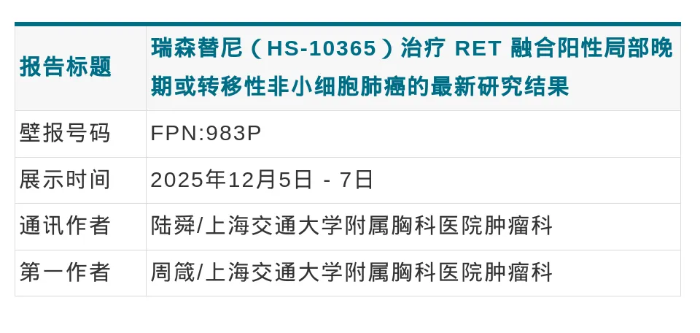 [1] Zhou Z, Wang Q, Wu L, et al. Resencatinib (HS-10365) in RET-fusion positive locally advanced or metastatic non-small cell lung cancer (NSCLC): Updated results [poster 983P]. Presented at: 2025 ESMO Asia Congress; December 5-7, 2025; Singapore.